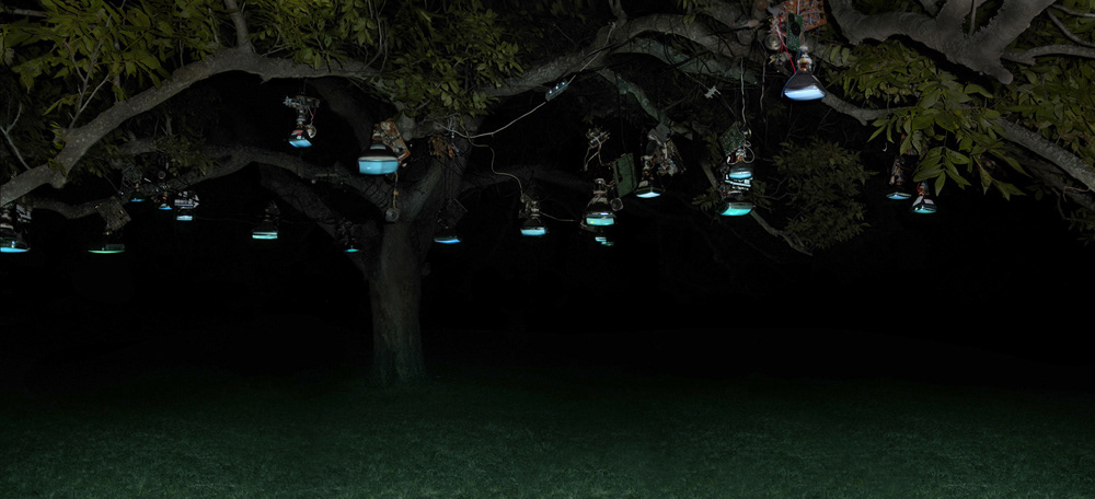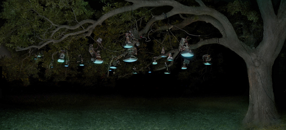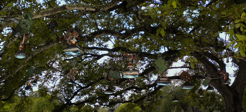 Eviscerated television sets hung from tree displaying video image in real-time through close circuit camera