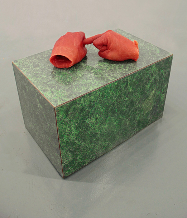 Wax (strawberry scented) cast of my hands, faux malachite podium.