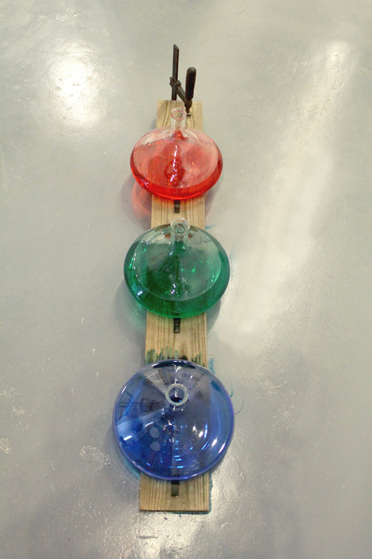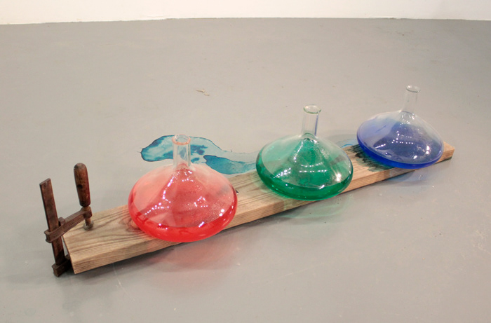 Glass laboratory flasks, wooden plank, arcane vice grip, colored fluid (RGB)